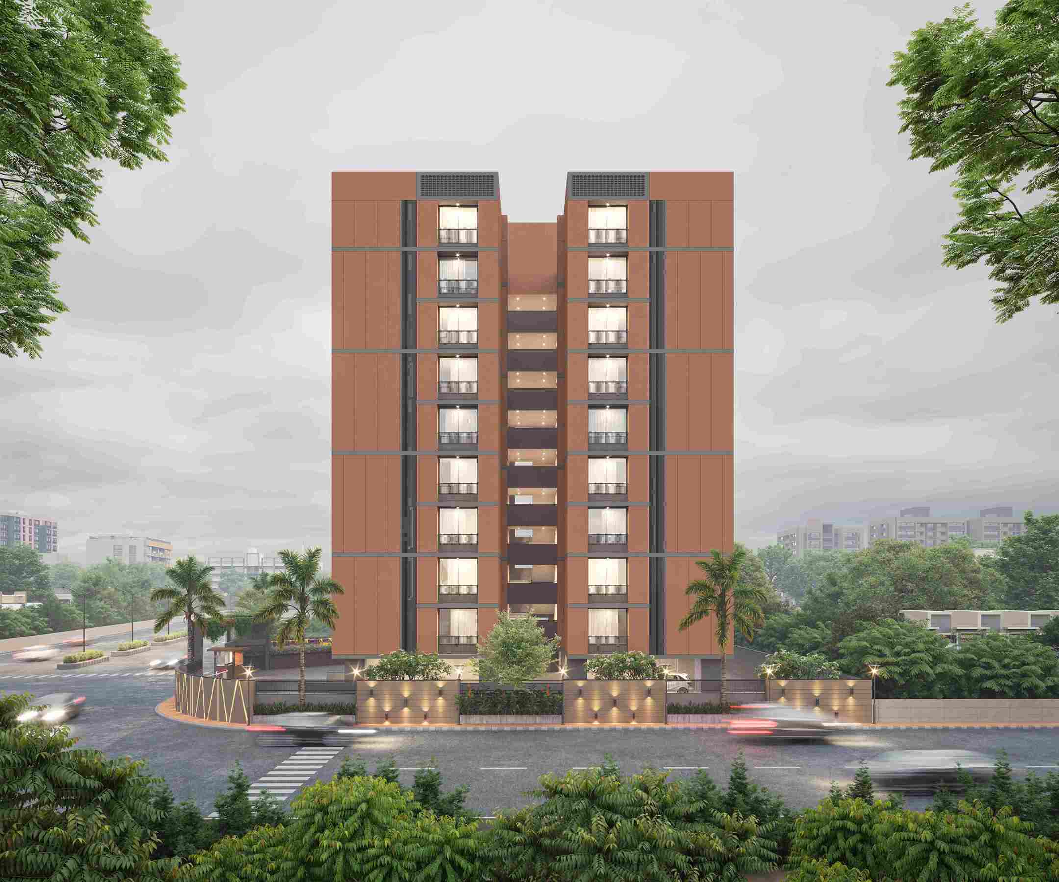 The site is located at Narangpura, Ahmedabad. With 36, 4 BHK. Luxurious apartments in the site area of 23040 sq. ft. The design revolves around the concept of horizontal and vertical axes which are reflected throughout the site. Amenities like a kid's play area, sitting space surrounded by landscape, and multi-purpose hall are provided.