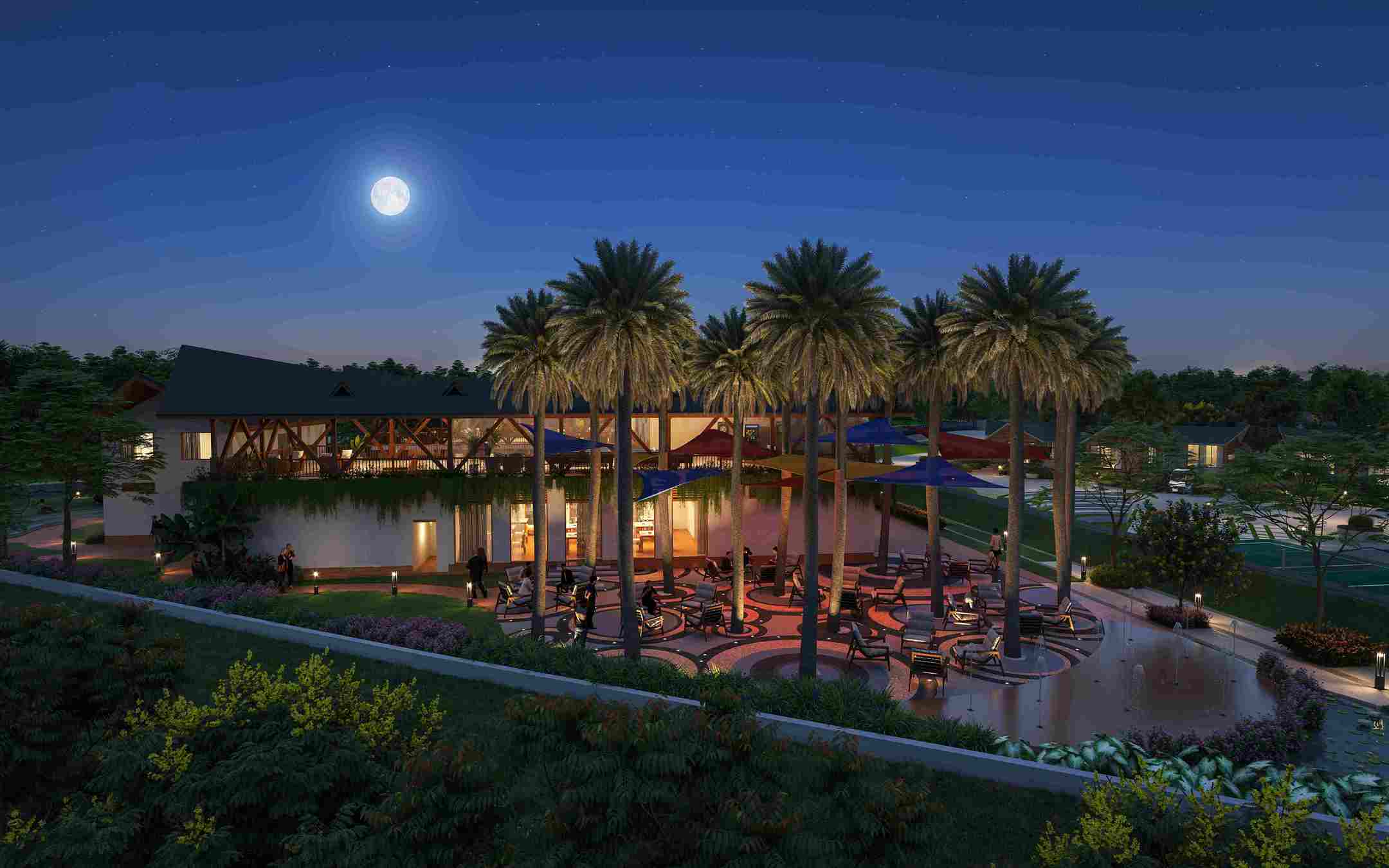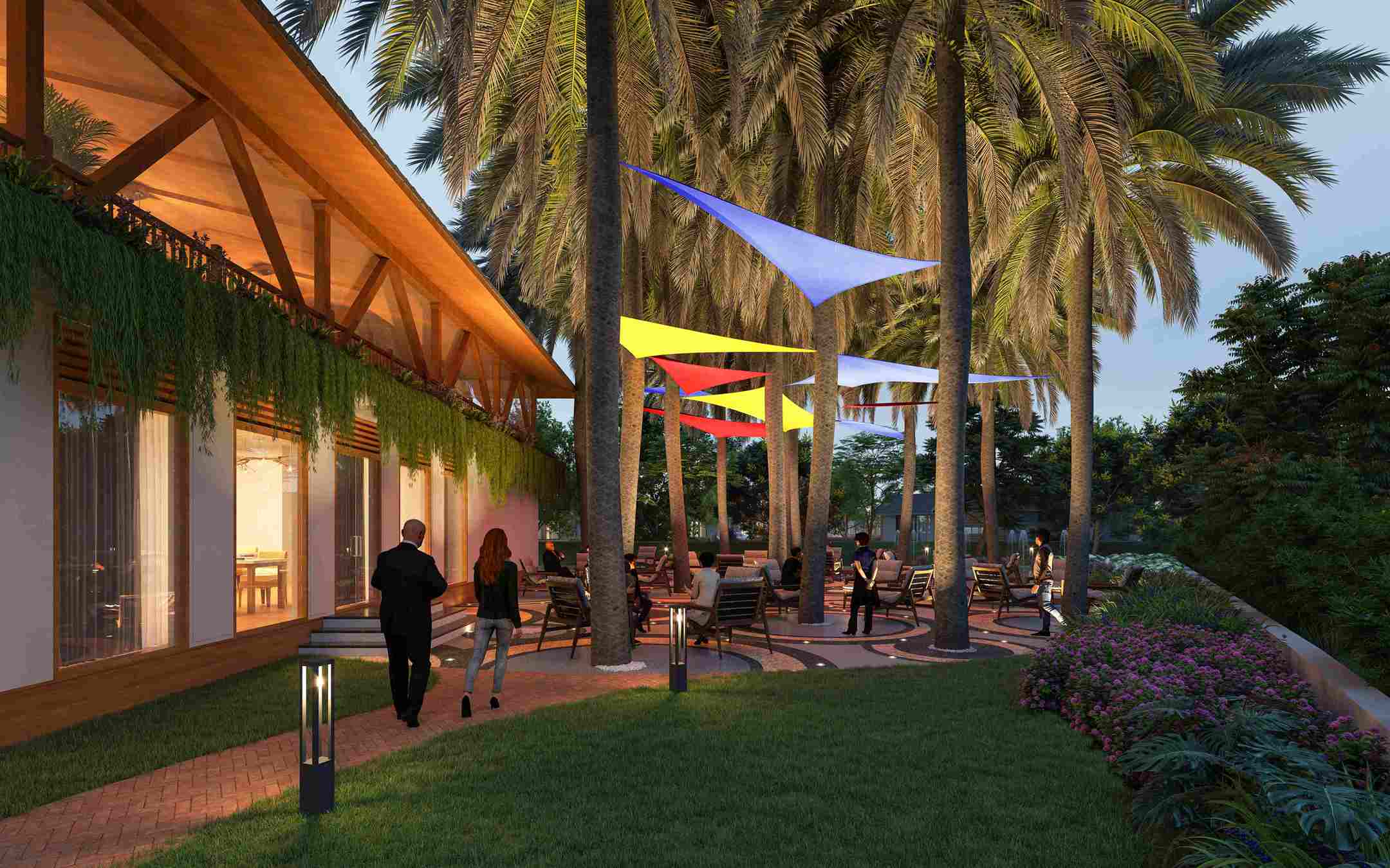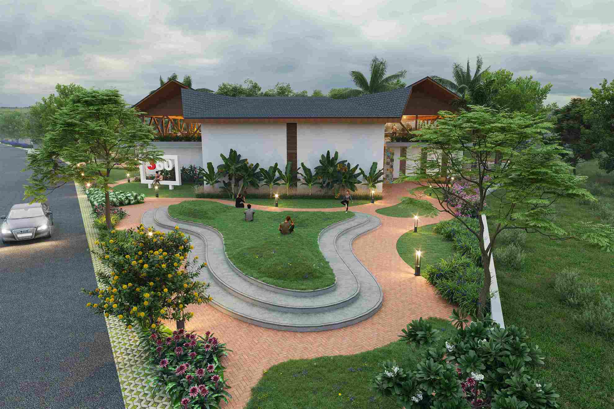The waiting area at the first story is supported by inclined vertical columns and a sloping roof which adds aesthetic value. Semi-covered space with a tensile roof in the surrounding offers calming sitting space with an adjoining landscape. Open space step sitting is proposed for enhancing the interaction. The clubhouse is a retreat in all the hustle and bustle of the city.