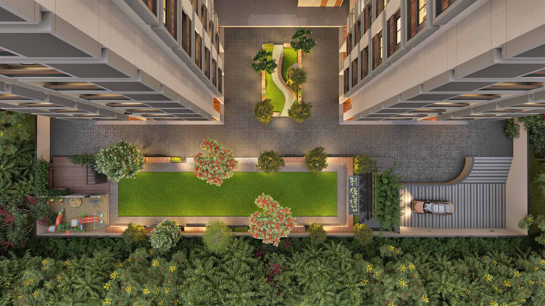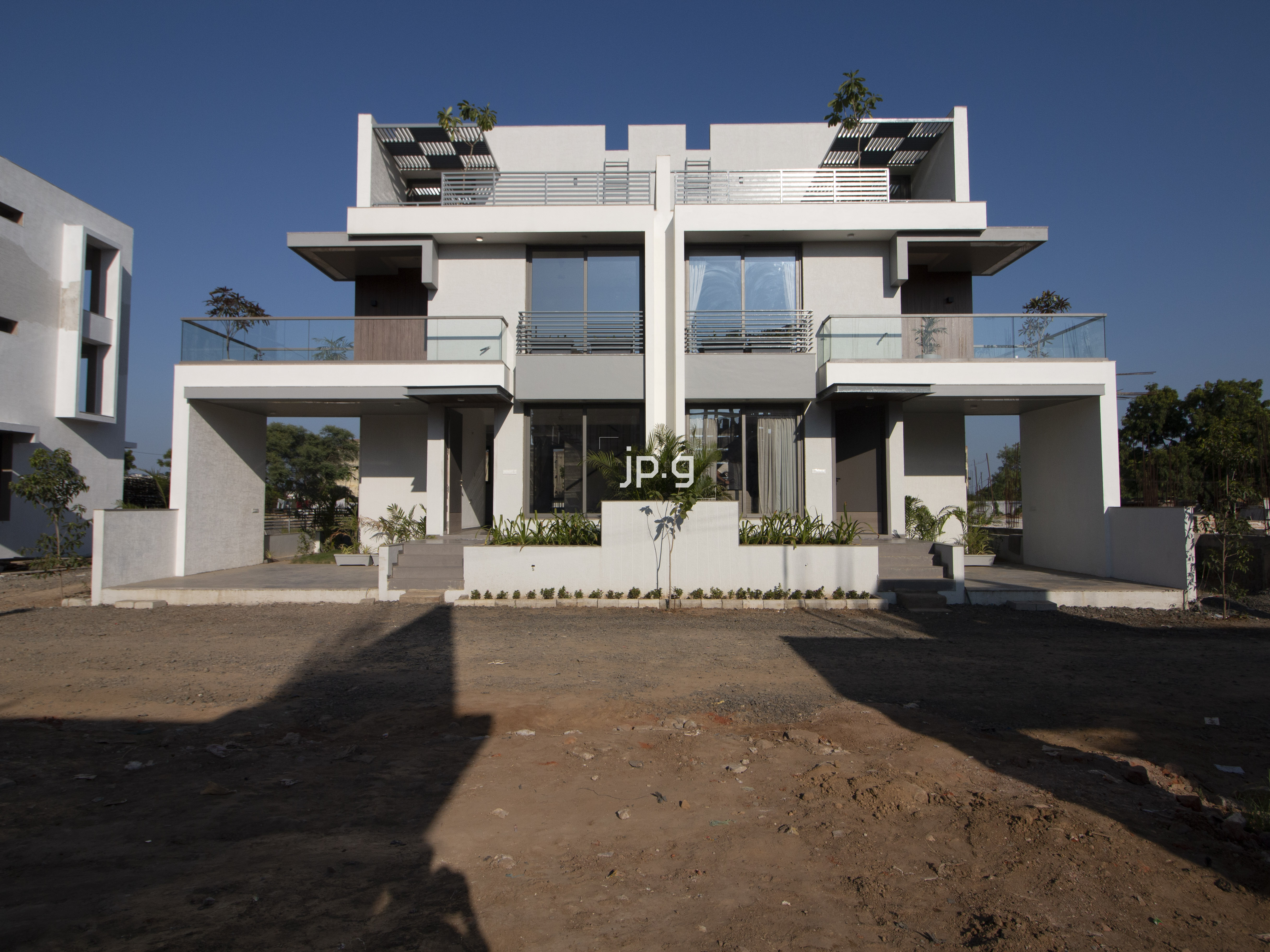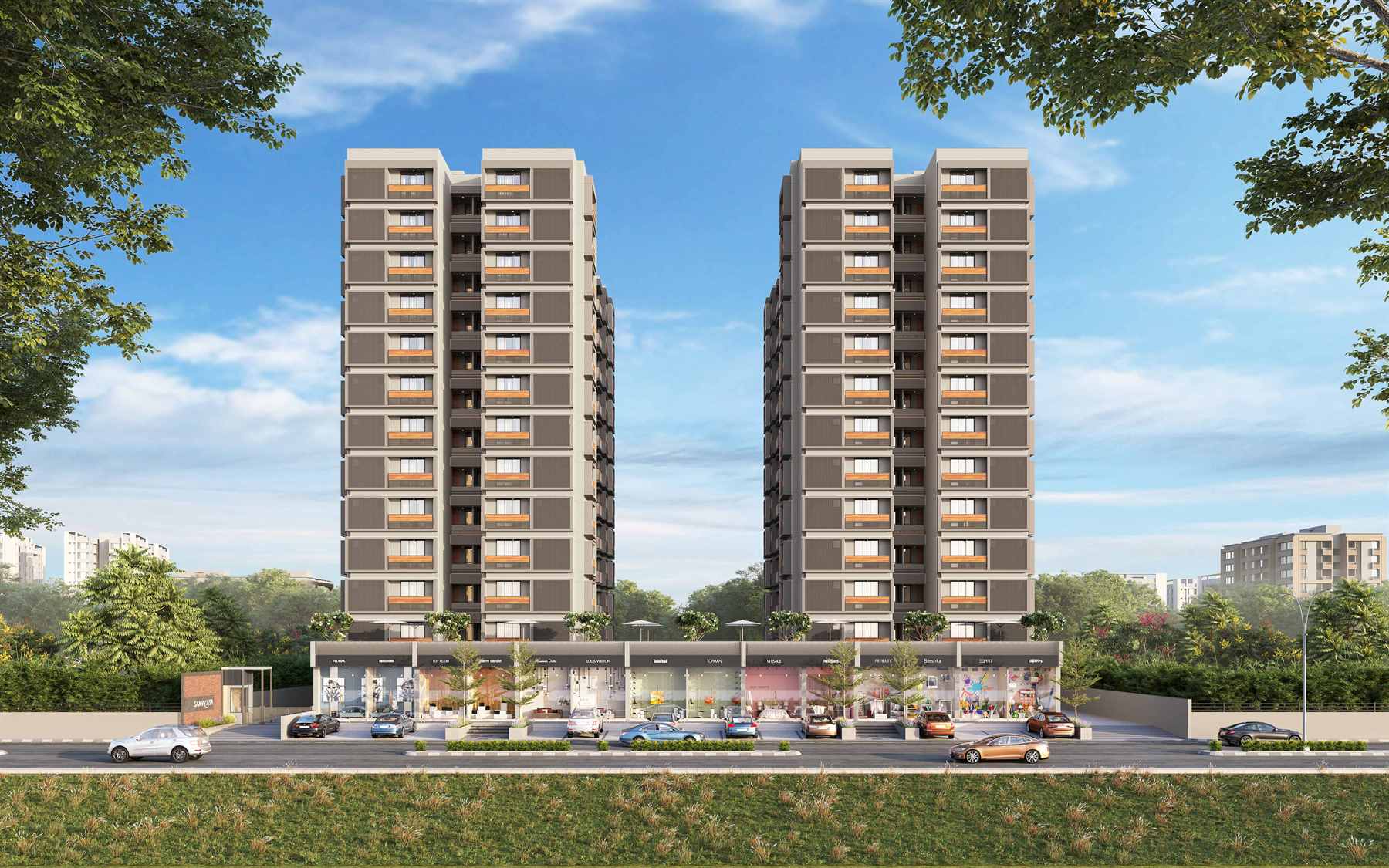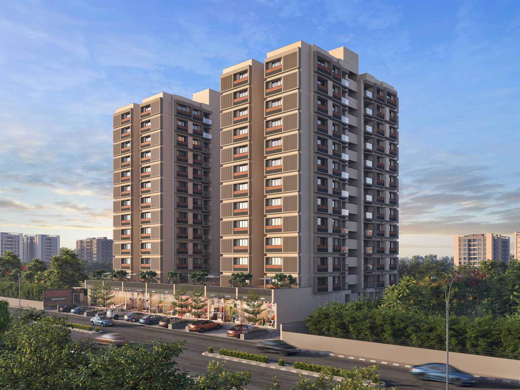 The site is located at South Bopal, Ahmedabad. A total of 37242 sq. ft. site area. It’s an affordable high rise having 94, 3 BHK flats and single story 14 shops on the ground floor having a total area of 9194 sq. ft. With no vehicle zone on the ground floor wherein, the hollow plinth is used for the amenities like gym, yoga center, multipurpose hall, indoor game house, tv room, etc., and the basement is used for parking. It also offers a spacious garden area for different activities. The site offers an astonishing living experience within the chaotic cityscape. It's a world within itself.
